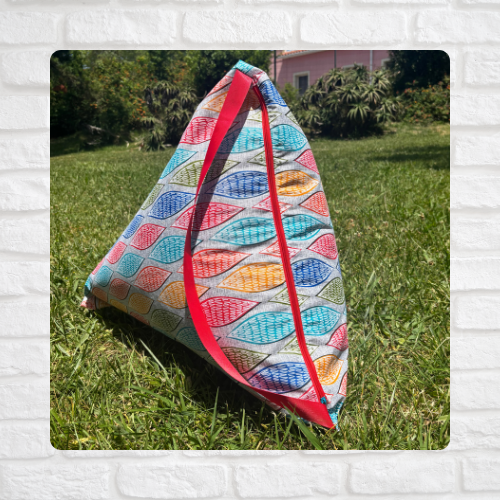• Mala triangular colorida com padrão de folhas, alça vermelha, sobre relvado