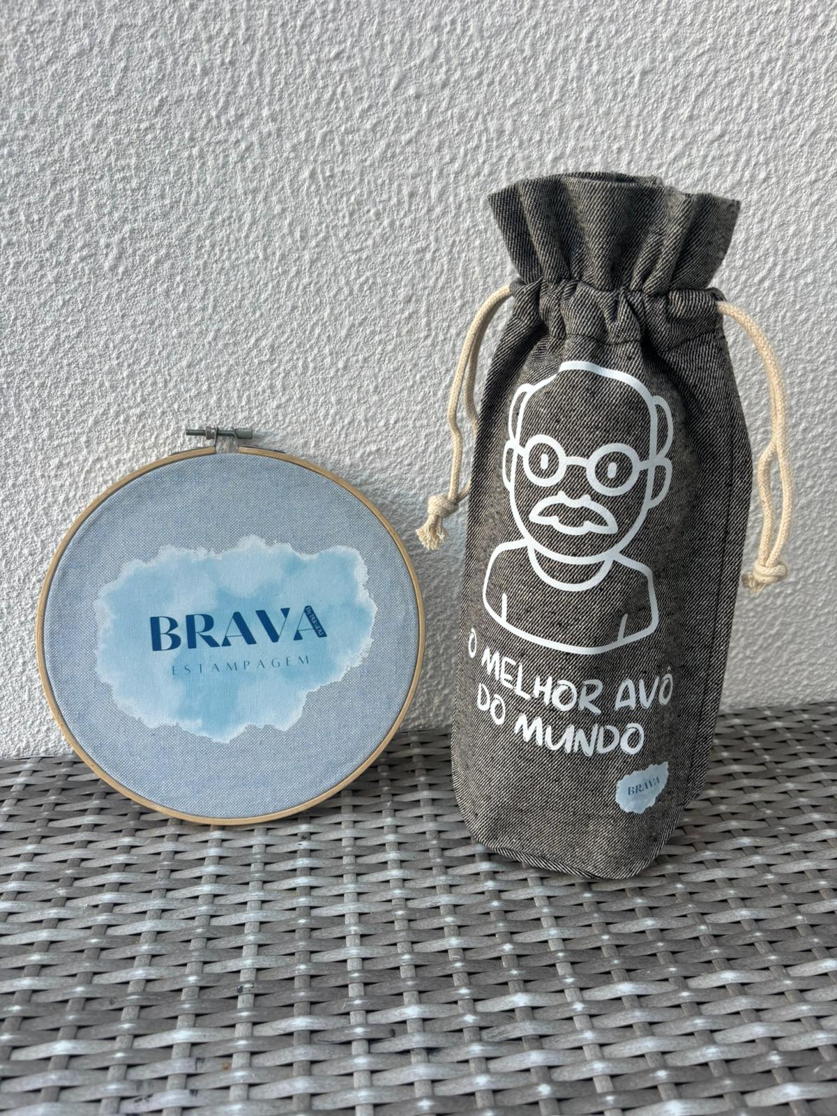 Saco cinzento de tecido com desenho de rosto e texto O MELHOR AVÔ DO MUNDO, e bastidor de madeira com tecido azul claro com texto BRAVA ESTAMPAGEM