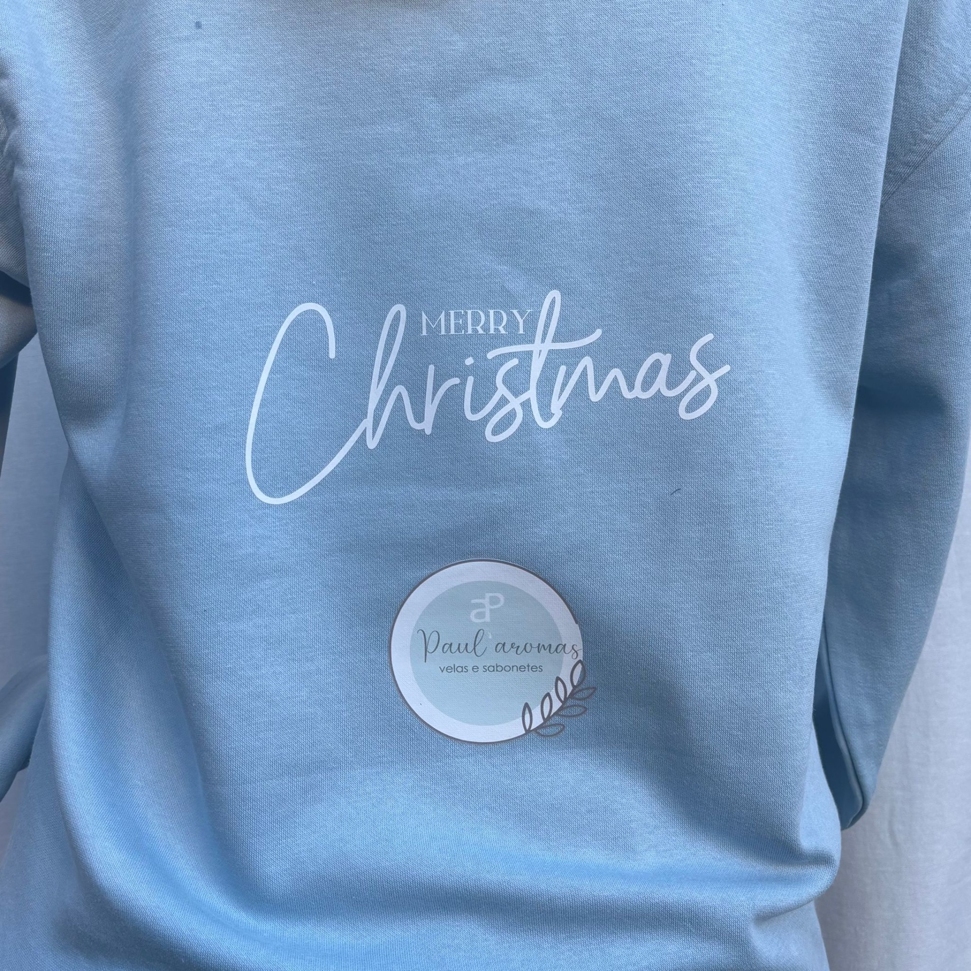 • Sweatshirt azul claro com texto Merry Christmas e etiqueta Paul aromas