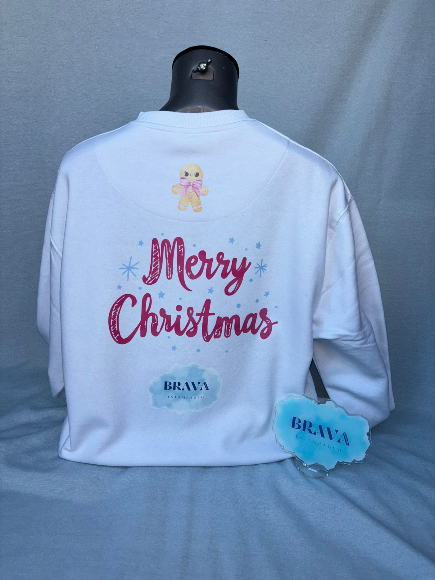 • Sweatshirt branca com estampa Merry Christmas e biscoito de gengibre no colarinho