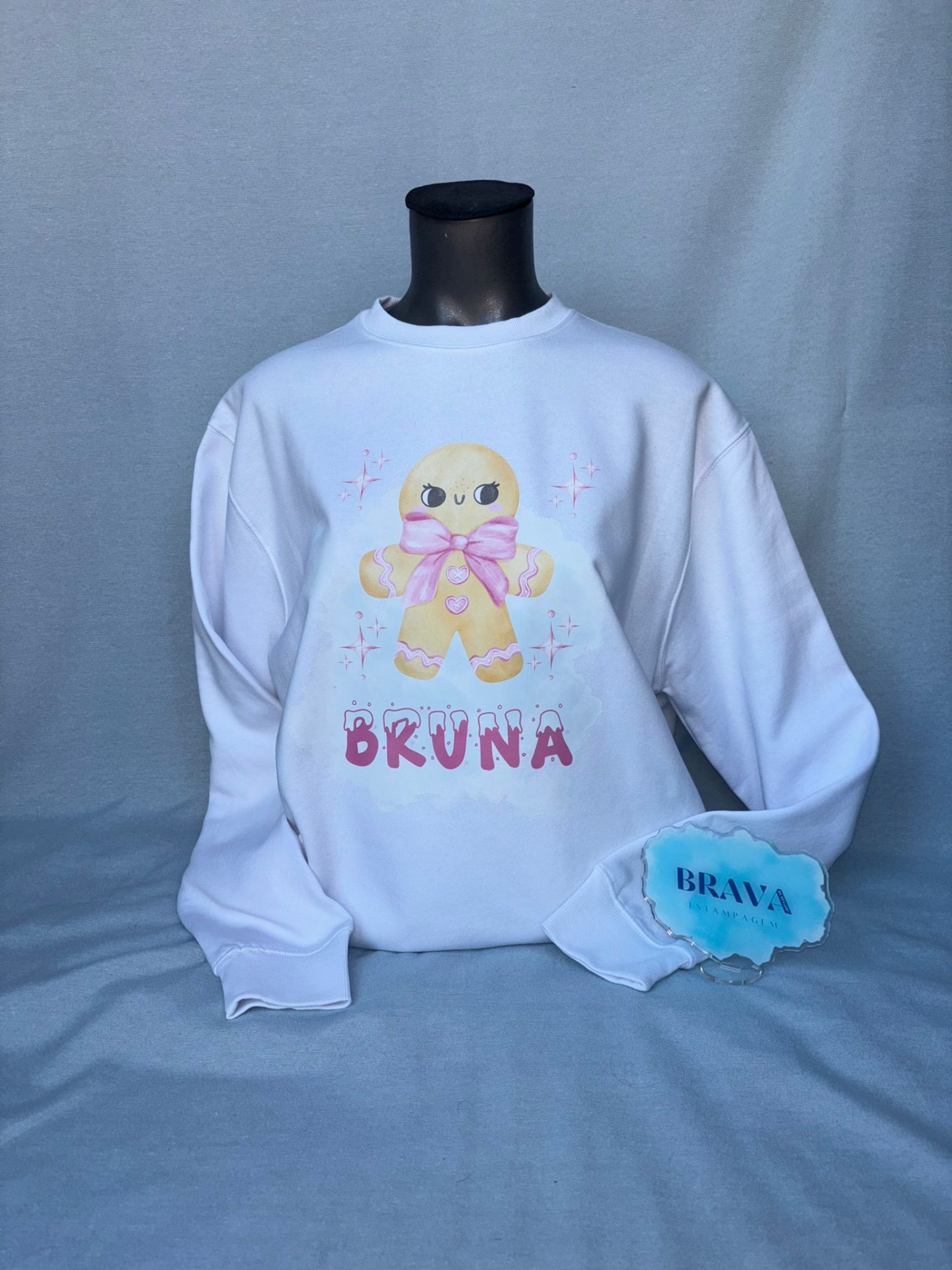 • Sweatshirt branca com estampa colorida de biscoito e nome BRUNA