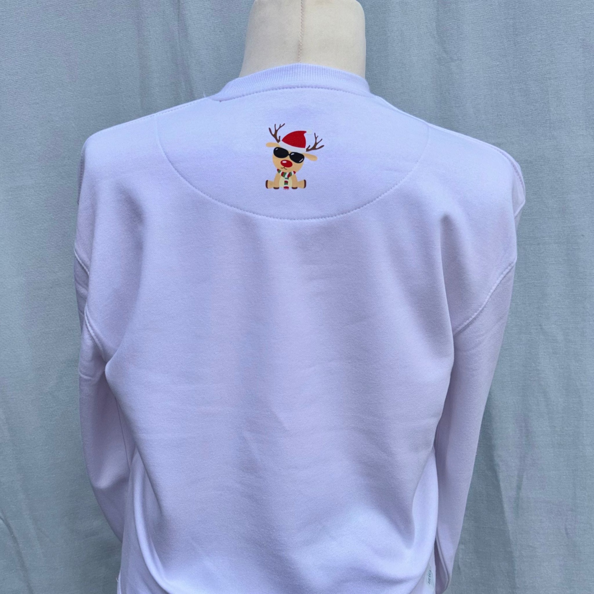 • Casaco branco com desenho de rena de Natal nas costas
