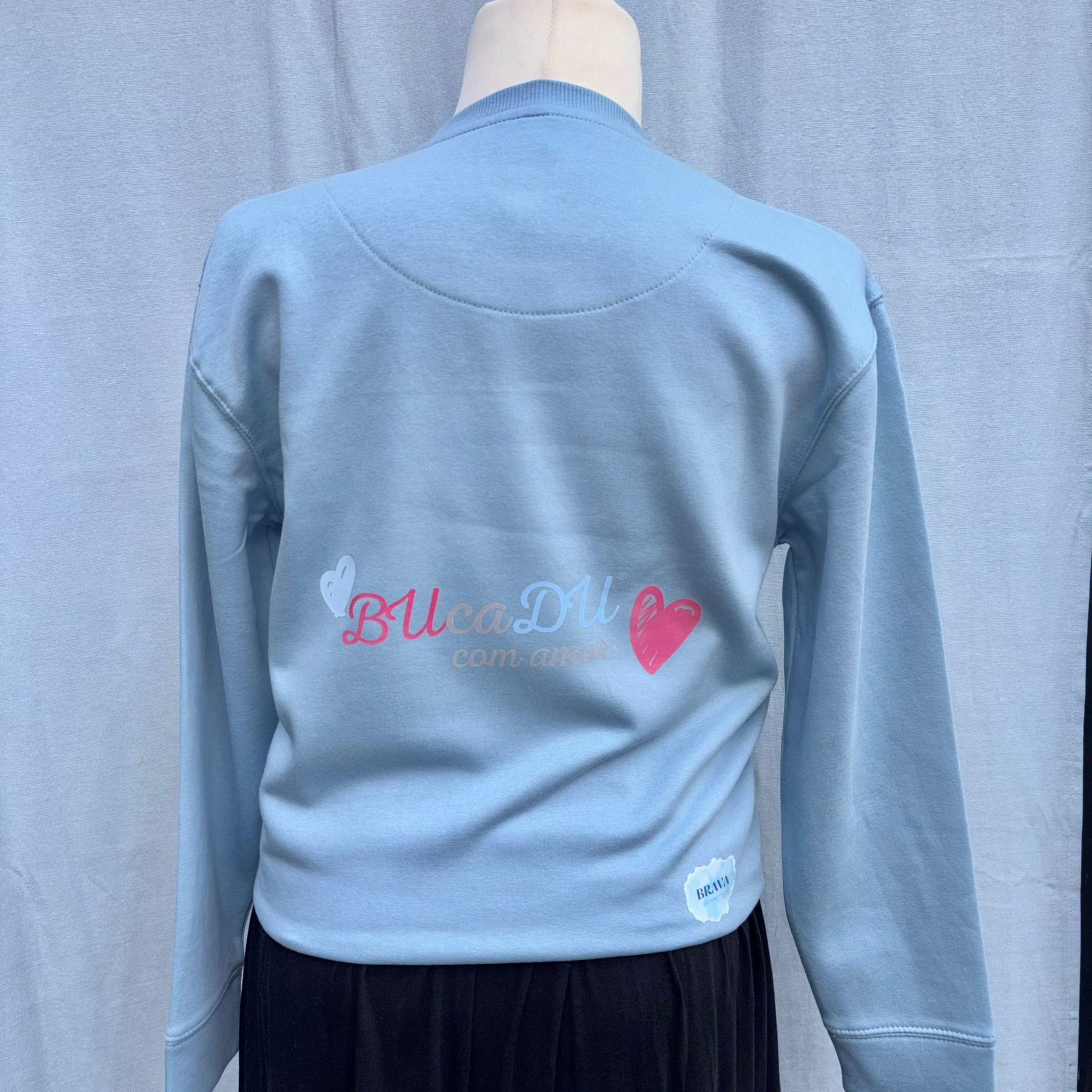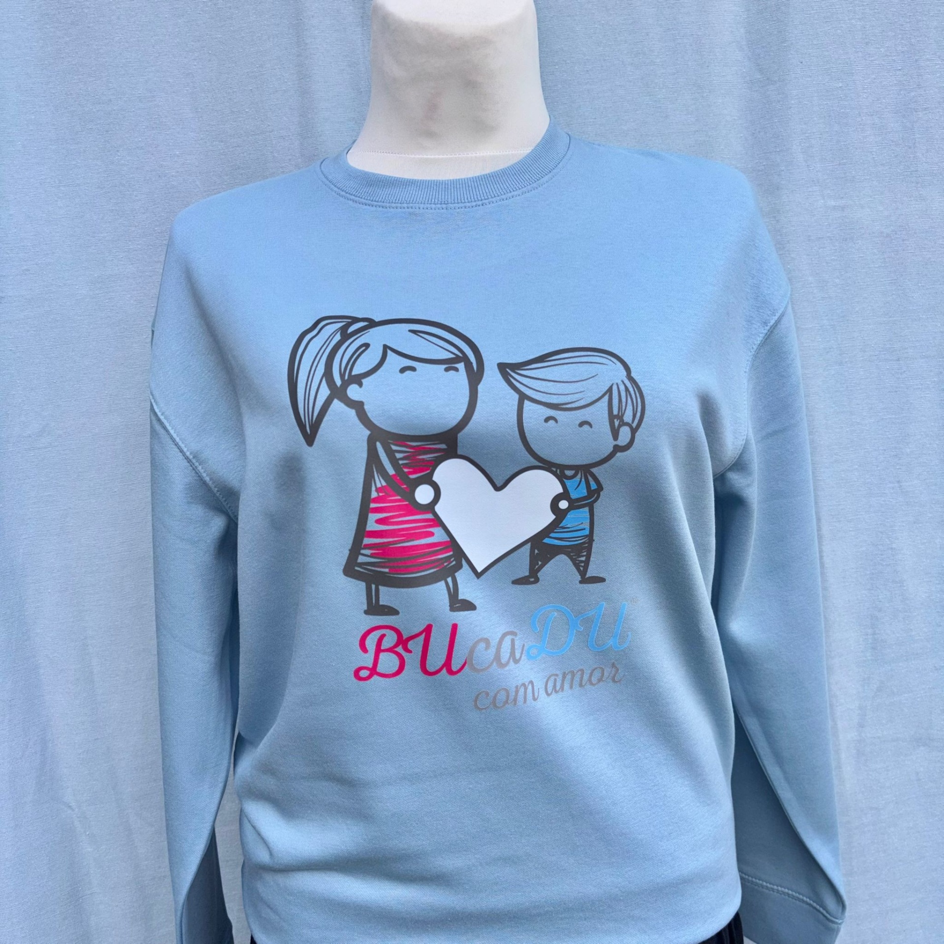 Sweatshirt azul claro com desenhos animados segurando coração e texto BUcaDU com amor