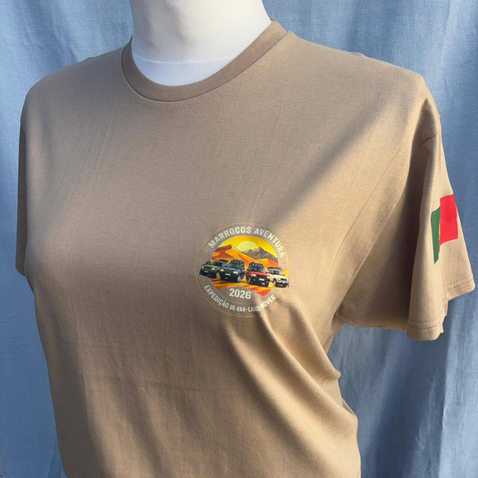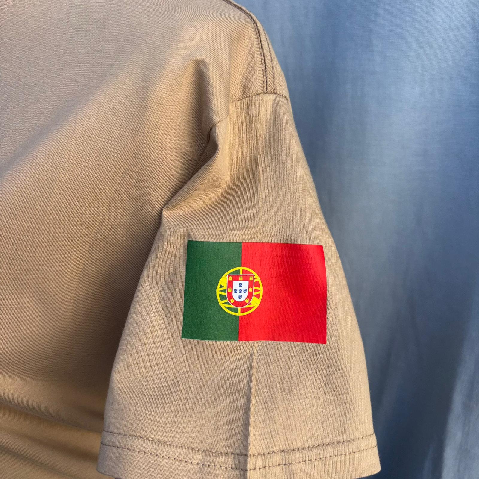 • T-shirt bege com bandeira de Portugal na manga direita.
